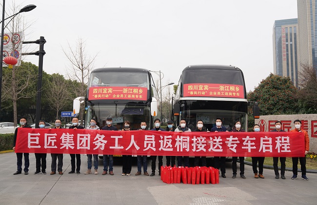 2月28日、29日兩天,6輛滿載巨匠人期盼的大巴車從桐鄉(xiāng)出發(fā),分別開往四川宜賓、南溪,云南昭通,安徽六安、宿州等地。“巨匠號”返崗專車將接送140余位工友回桐返崗。